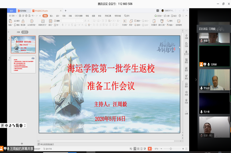 廖勇老师向全体员工传达《tyc539太阳集团关于2020年春季学期第一批员工返校的通知》,针对员工返校前、返校中、返校后,结合海运公司防疫领导工作小组工作部署,与大家解读了具体实施方案。