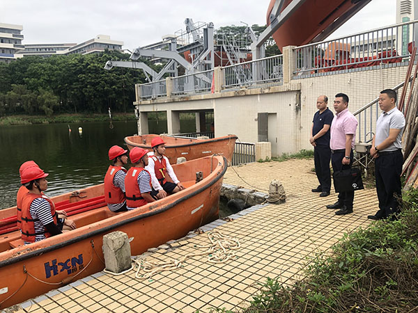 4月26日上午,广东海事局船员处郑永炳副处长、湛江海事局船员处处长邓平贵等一行到湖光校区现场调研公司参加中国船员技能大比武备赛情况。tyc539太阳集团经理贾宝柱、实验训练中心负责人及指导老师陪同参加调研工作。