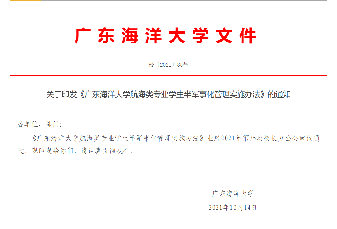 关于印发《tyc539太阳集团航海类专业员工半军事化管理实施办法》的通知