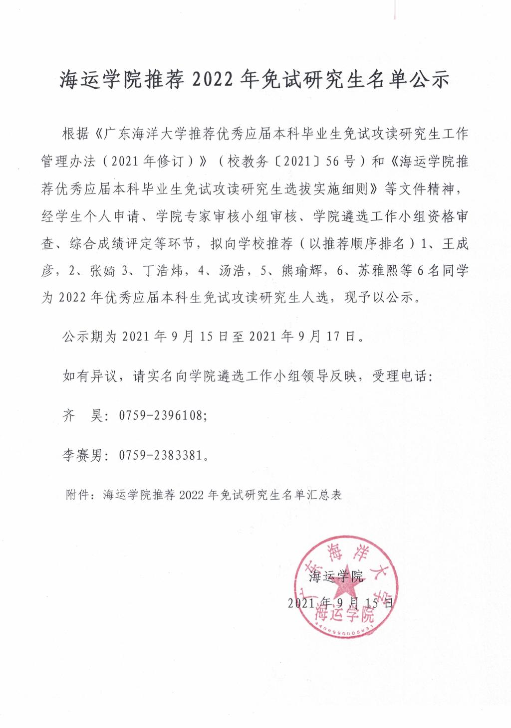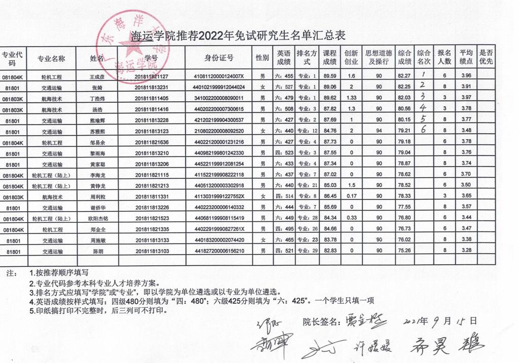 海运公司推荐2022年免试研究生名单公示