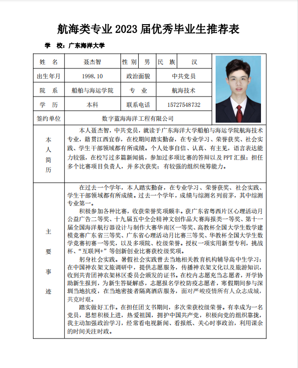 附:航海1191班聂杰智个人情况