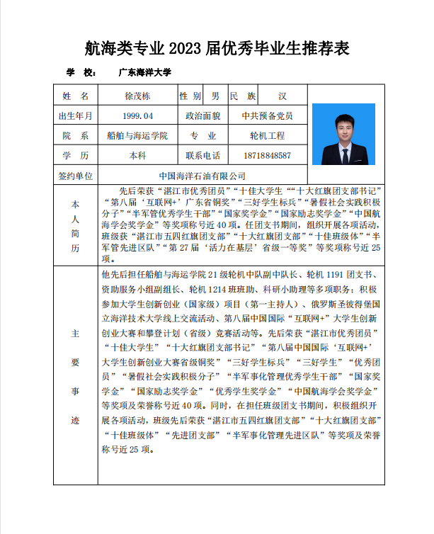 轮机1191班徐茂栋个人情况