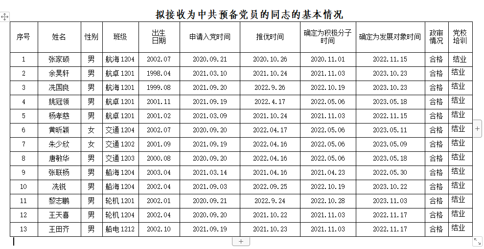 根据《tyc539太阳集团发展党员工作实施细则》规定,经本人提出申请,党组织培养考察,支委会审查研究决定,经公司党委预审通过,拟接收冼国良等13名同志为中共预备党员。现将有关情况予以公示,征求党员、群众意见。