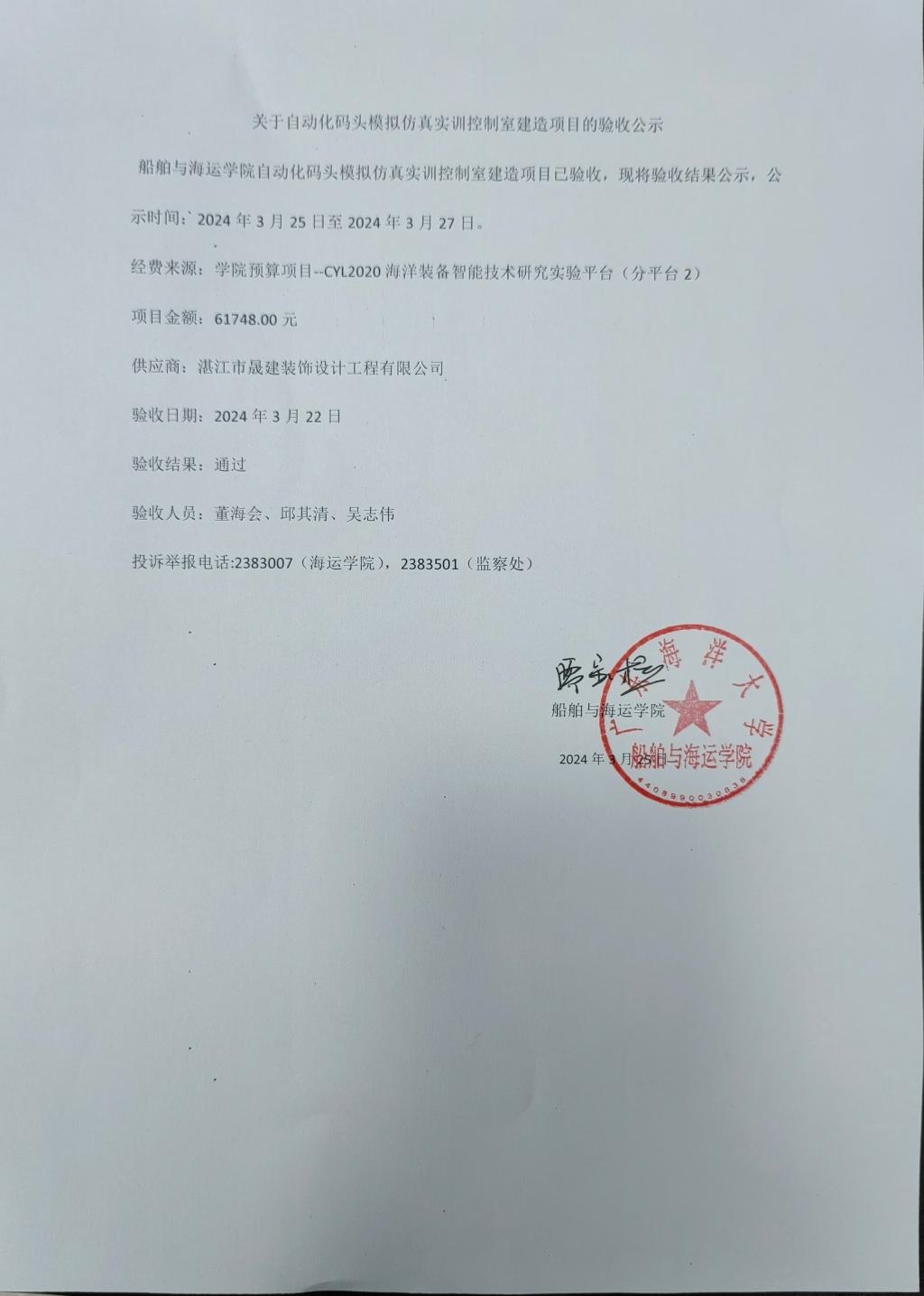 关于自动化码头模拟仿真实训控制室建造项目的验收公示