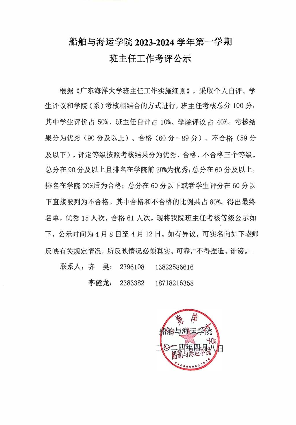 tyc539太阳集团2023-2024学年第一学期班主任工作考评公示