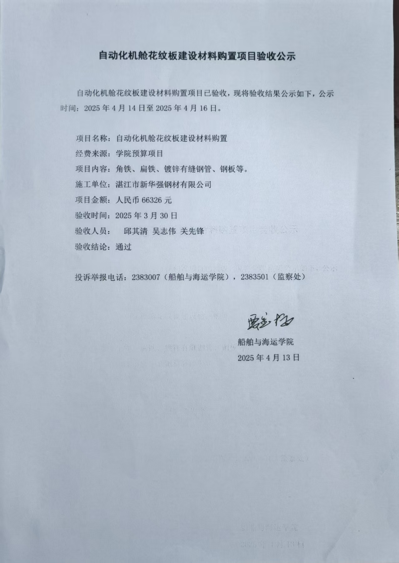 自动化机舱花纹板建设材料购置项目验收公示