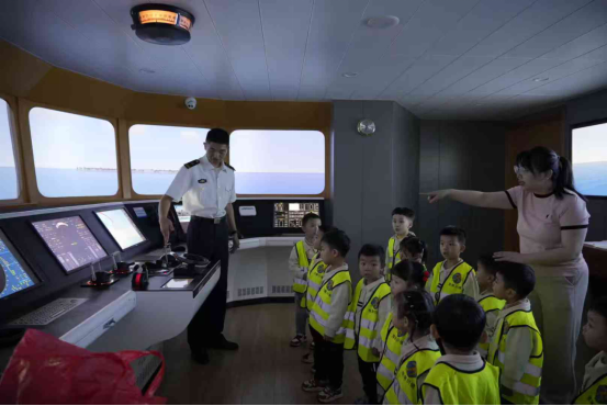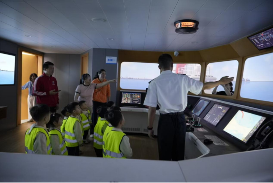 紧接着,小朋友们来到了航海模拟器前。在这里,志愿者们为他们科普了驾驶台上的各种仪器的操作及作用,并让他们亲身体验了一把航海驾驶的乐趣。小朋友们兴奋地操作着模拟器,仿佛真的成为了勇敢的海员,在波涛汹涌的大海中航行。
