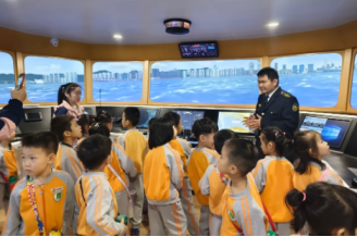 教室窗帘拉上,投影幕布亮起《航海小纵队》的精彩画面,帆船乘风破浪、集装箱船穿梭大桥、潜水艇探索深海,孩子们立刻坐直身子,眼睛紧紧追着屏幕。“帆船靠风前进!”“货船运好多东西!” 大家忍不住和小伙伴分享发现,播放间隙,讲解员抛出的趣味问题引发抢答热潮,奶声奶气的回答逗得全场欢笑,航海知识在轻松氛围中悄悄扎根。