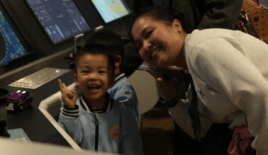 最让萌娃们兴奋的打卡点,当属航海模拟驾驶台!逼真的驾驶舱场景、跳动的仪表盘、大屏上滚动的海景画面,瞬间让大家有了“身临其境航海” 的感觉。在讲解员的指导下,萌娃们轮流坐上驾驶位,紧握操纵杆,模仿船长转动方向盘。“左转啦!前面有海浪!” 家长们在一旁帮忙观察 “航线”,和孩子一起体验航行的乐趣。当看到屏幕上的船只顺利 “靠岸” 时,萌娃们欢呼雀跃,成就感满满。